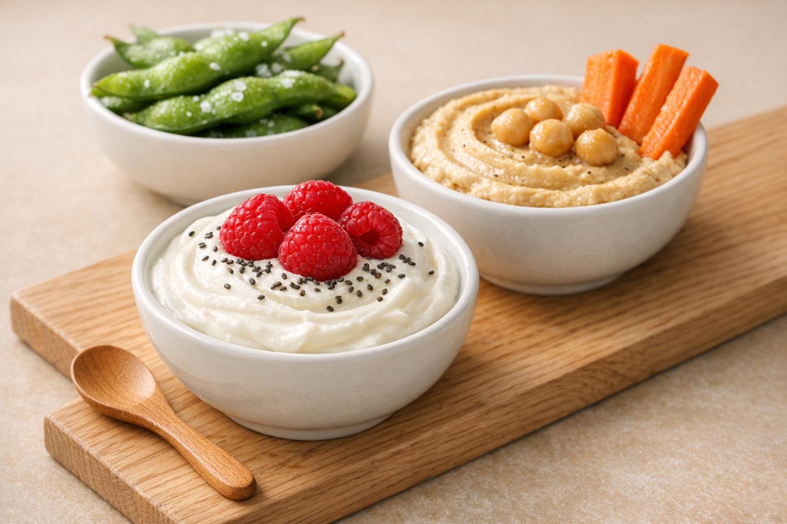 8 easy, portable vegan snacks that deliver protein and fiber—roasted chickpeas, edamame, hummus, chia pudding, protein balls, tofu mousse, and seed crackers.